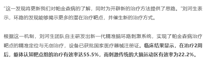 ② 现在发现是整个“电路系统”乱了:刘河生教授团队发现,帕金森病真正的问题是一个连接多个脑区的庞大“电路系统”——“躯体认知环路” 出了故障。这个环路负责把我们的认知、运动和身体状态联系起来 。